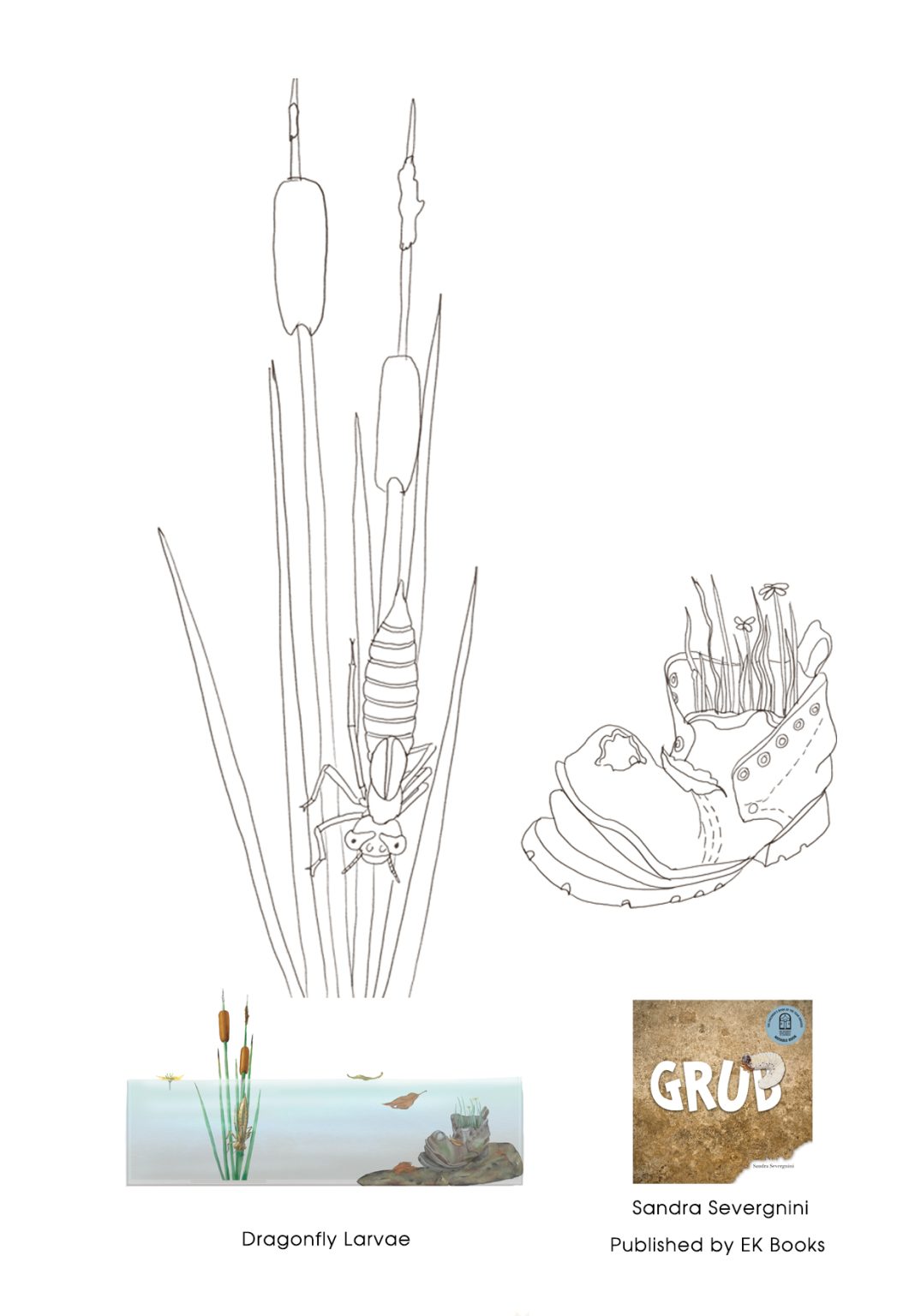 The end pages, as with most of the double page spreads, lure your eyes to the wonderfully detailed drawings. When Grub is young, you will have to search for him beneath the tree canopy and in the old rotten log. As he grows, he is more recognisable. He is aware that his body will change, but what will he become?
